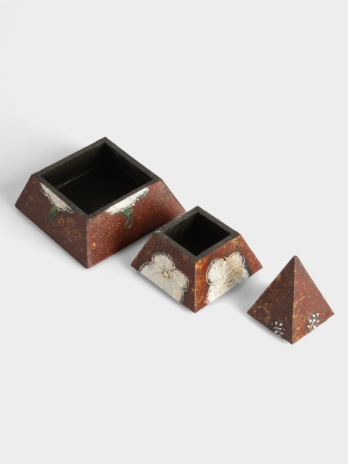 Шкатулка в форме пирамиды — фигурная коробка из МДФ тёплого коричневого оттенка с растительным орнаментом. Её геометрия вдохновлена формами древних символов, а мягкие линии цветочного узора добавляют уюта и живости. Это не просто ёмкость для хранения — это скульптура, которая превращает полку или туалетный столик в пространство с историей.