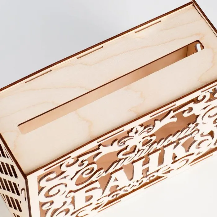 Шкатулка выполнена из качественной фанеры и имеет бежевый цвет, что позволяет легко интегрировать её в любой интерьер. Размеры 24×10×16 см делают её компактной, но в то же время вместительной для сбора пожеланий и подарков от гостей.