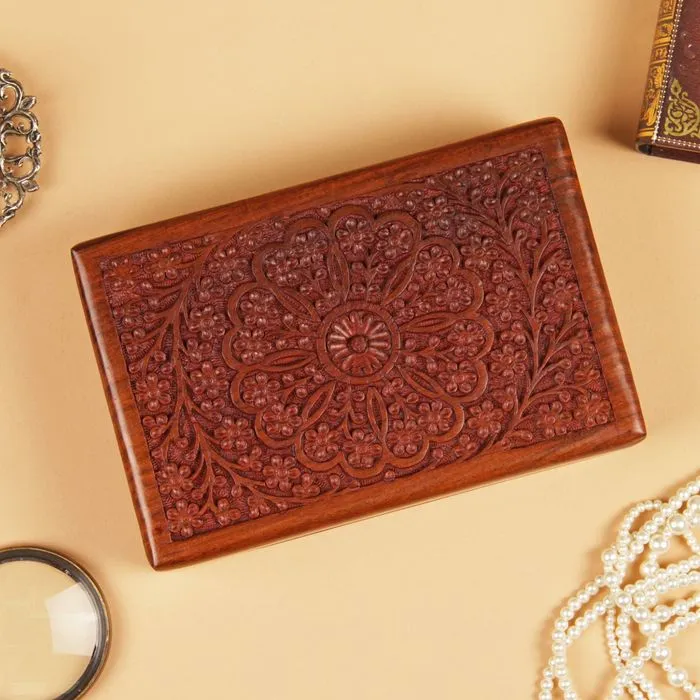Резная шкатулка из дерева шишам с изящными узорами станет стильным аксессуаром для хранения украшений или небольших ценных вещей. Её лаконичный прямоугольный дизайн и натуральный коричневый оттенок гармонично впишутся в интерьер, добавляя ему уюта и элегантности.