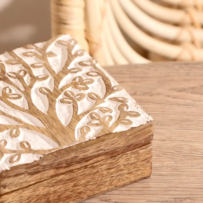 Внушительная шкатулка "Цветущее дерево" дерево 14х14х6 см выполнена вручную индийскими мастерами-ремесленниками из натурального массива дерева. Вы только взгляните на утолщённые стенки этого прекрасного аксессуара, в такой шкатулке все Ваши украшения будут в надёжном месте. Оригинальный орнамент, форма, приятный цвет дерева - всё это будет замечательно сочетаться с любым интерьером, будь то спальная или гостиная. Это не просто шкатулка, это настоящее произведение искусства, истинная ручная работа, которая станет не только приятным предметом женского обихода, но и ценным подарком любому ценителю красоты и экзотики.