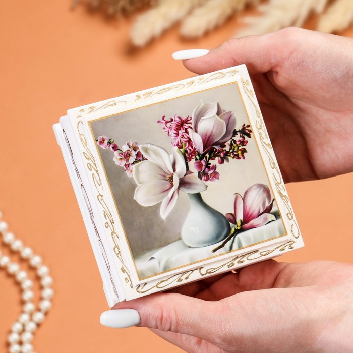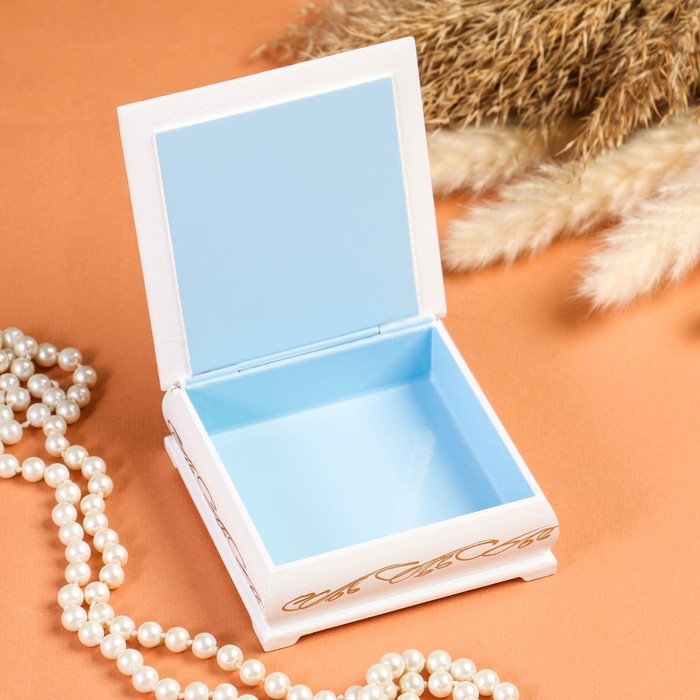 Шкатулка изготовлена из дерева, покрыта краской. Заранее напечатанное изображение приклеено и покрыто лаком. Дополнительно мастер наносит узор.