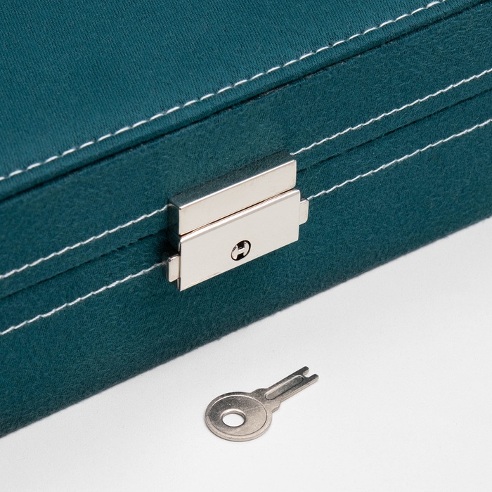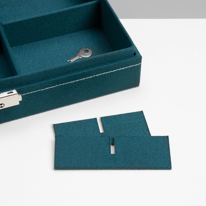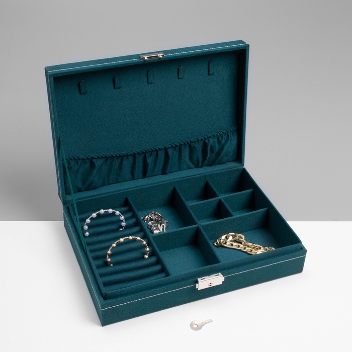 Внутреннее пространство организовано с помощью делений, которые специально разработаны для колец, серёг, цепочек и кулонов. Надёжный замочек гарантирует безопасность содержимого, а мягкое флоковое покрытие придаёт изделию приятную текстуру и изысканный внешний вид.