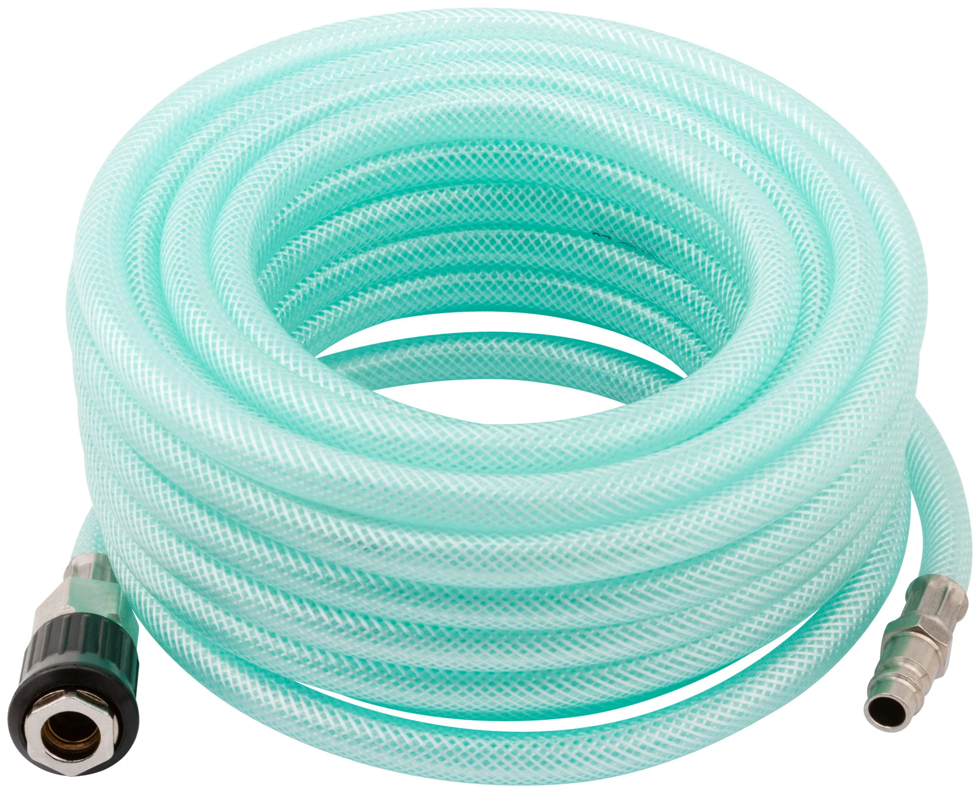 Шланг изготовлен из армированного ПВХ с полимерными нитями, что обеспечивает надежность и долговечность. Оснащен быстросъемными коннекторами 1/4'' европейского типа, что ускоряет процесс подключения и отключения оборудования.