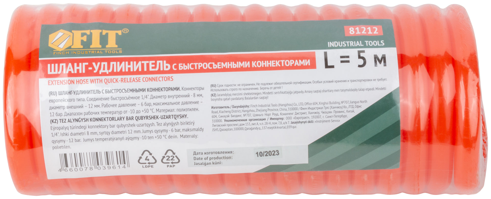 Шланг-удлинитель FIT 81212 с европейскими быстросъемными коннекторами подходит для подключения к пневматическому инструменту в мастерской или на стройплощадке. Он обеспечивает надежное соединение и удобство использования, позволяя работать на расстоянии до 5 метров от источника воздуха.