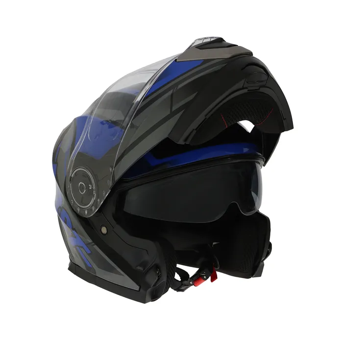 Модулярный шлем - это защитный головной убор, с поднимающейся подбородочной частью. Этот тип шлема представляет собой комбинацию полнолицевого и открытого шлема, что делает его универсальным и удобным для использования в различных условиях. Шлем модуляр обеспечивает высокий уровень защиты головы и лица мотоциклиста от возможных травм и повреждений на дороге. Кроме того, модулярный шлем оснащен встроенным солнцезащитным визором, который помогает защитить глаза мотоциклиста от яркого солнечного света. Модуляр также имеет систему вентиляции со шторками для регулировки обдува, которая обеспечивает достаточное количество свежего воздуха внутри шлема, что позволяет мотоциклисту чувствовать себя комфортно даже в жаркую погоду. Внутренняя съемная подкладка выполнена из качественных материалов и не имеет резких, ярко выраженных запахов. Шлем изготовлен из качественного ABS пластика, который в свою очередь обладает долговечностью, высокой механической прочностью.