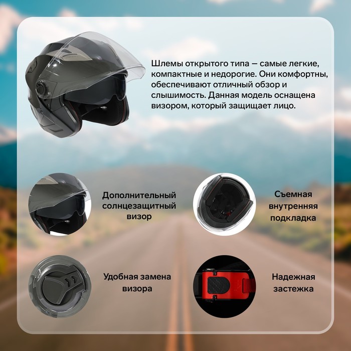 Удобство открытых шлемов заключается в облегчённой конструкции, что дает большее ощущения свободы как во время езды, так и на коротких остановках. Отсутствие полной изоляции от окружающей среды позволяет воздуху свободно циркулировать, что может снизить температуру головы и улучшить комфорт во время интенсивных занятий. Они комфортны, обеспечивают отличный обзор и слышимость. Преимущество данной модели в том, что она оснащена ветрозащитным экраном и солнцезащитным визором. Внутренняя съемная подкладка выполнена из качественных материалов и не имеет резких, ярко выраженных запахов. Шлем изготовлен из качественного ABS пластика, который в свою очередь обладает долговечностью, высокой механической прочностью.