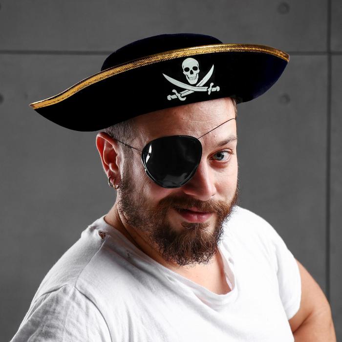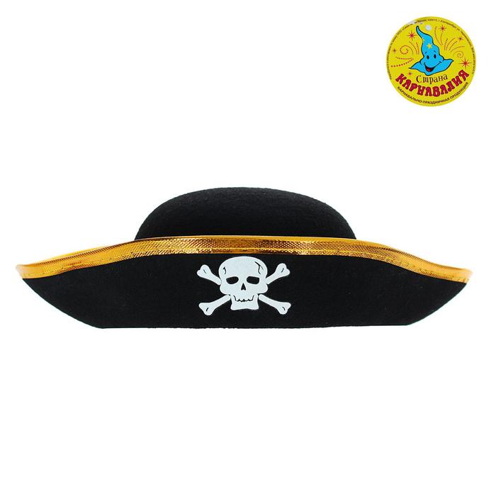 Шляпа пиратская, детская, золотистая каемка, р-р. 50 отличное дополнение к вашему образу. Мы предлагаем для вас множество вариантов, как эффектно появиться на вечеринке в образе пирата. Кинжал, костюм, бандана, попугай на плече и бутылка рома в руках – вот составляющие образа морского разбойника. Но все же шляпа остается важной деталью в образе.