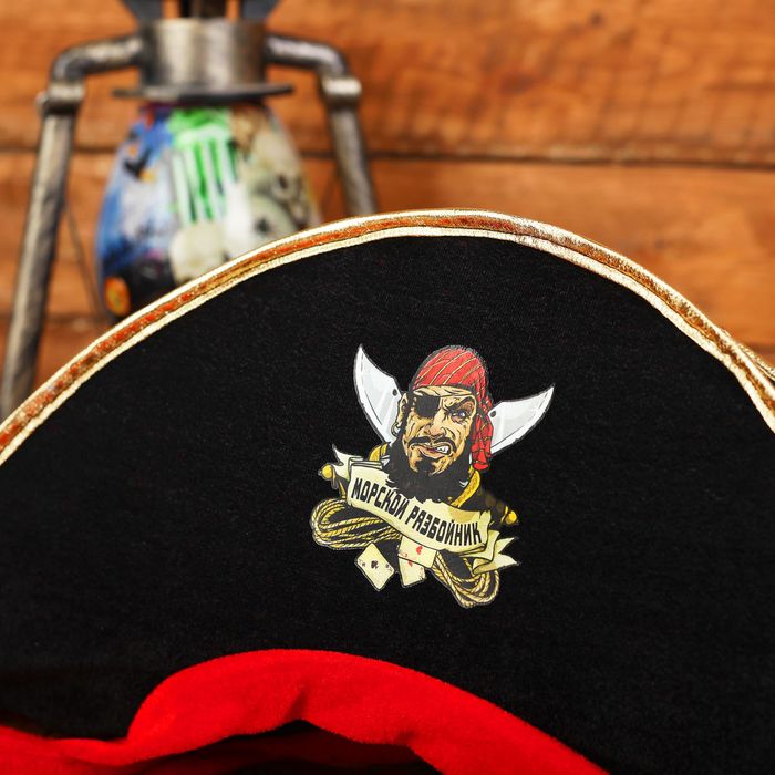 Аксессуар сделан из плотной ткани, украшен контрастной каймой и оригинальной надписью. Уникальный дизайн шляпы сделает вас неотразимым, как раз таким и должен быть настоящий пират!