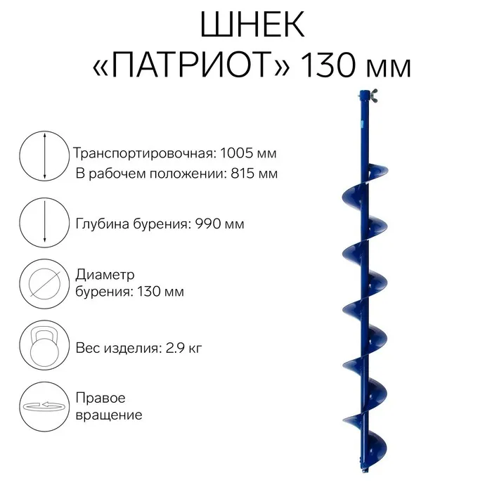 Шнек "Патриот", под шуруповёрт, без адаптера, 130 мм, лезвие, чехол, молоточек, набор — Характеристики