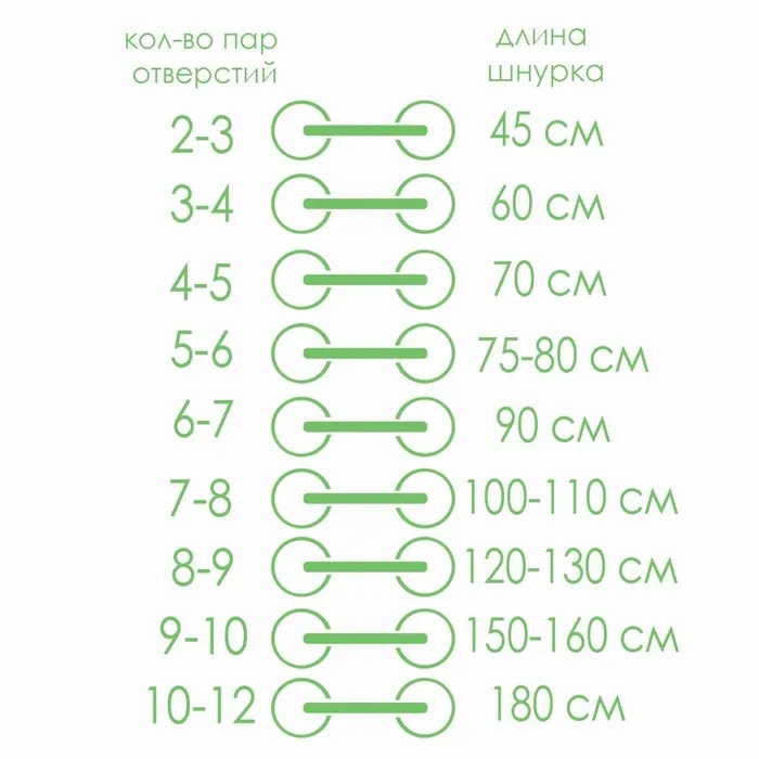 Приятный бонус: метровая длина позволит использовать один шнурок на одну пару обуви небольшого размера с 3–4 люверсами. Второй шнурок можно оставить про запас или использовать в другой паре обуви, приобретя дополнительные фиксаторы.