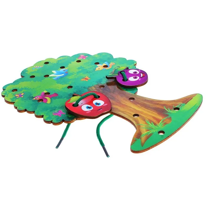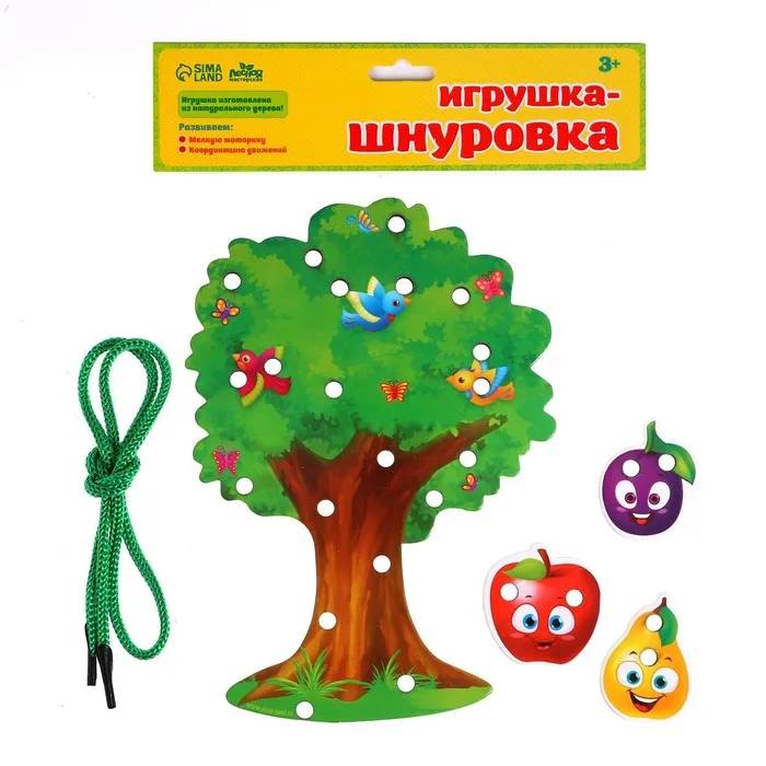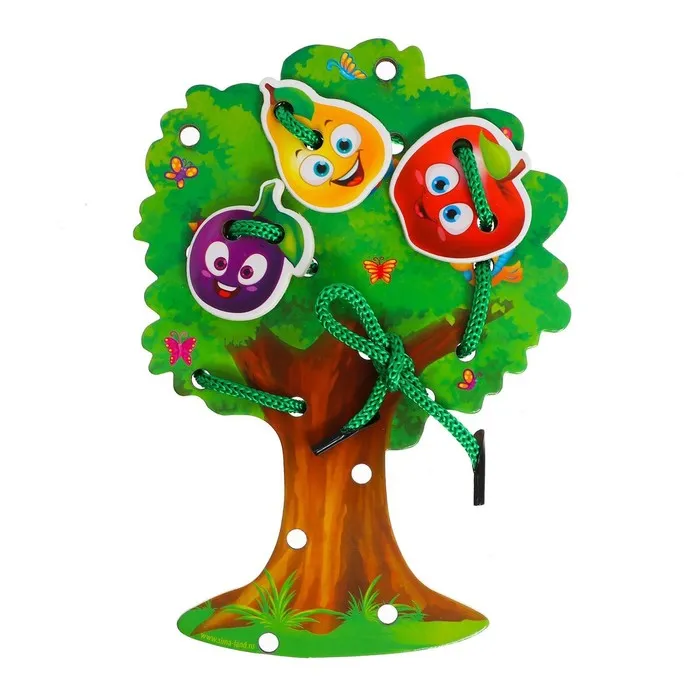Деревянная шнуровка «Фруктовое дерево» — это яркая и увлекательная игрушка, которая помогает детям от 3 лет развивать моторику, логическое мышление и знакомиться с миром фруктов. Состоит из деревянной основы в виде дерева и разноцветных элементов, которые малыш прикрепляет с помощью шнуровки.