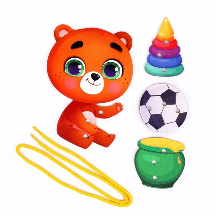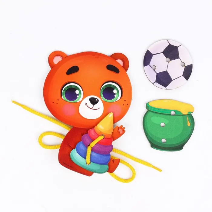 - Задача малыша — продевать шнурок сквозь отверстия в игровом поле.