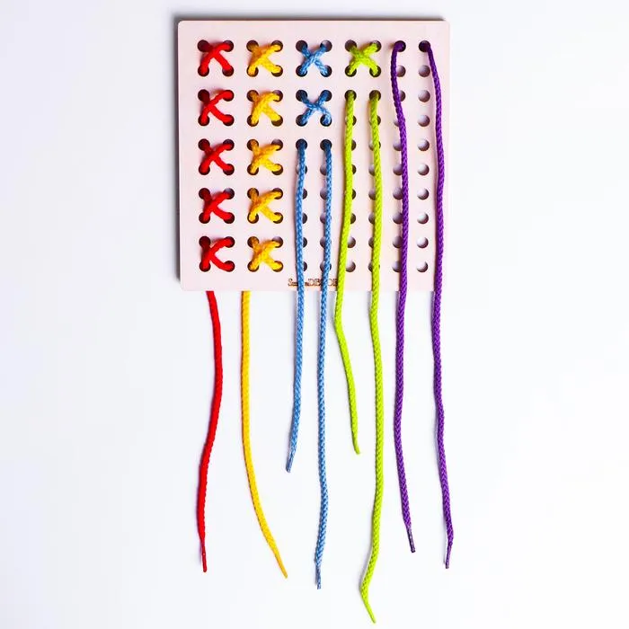 - Продевая шнурок через отверстия, малыш тренирует мелкие мышцы рук, что важно для подготовки к письму и рисованию, при этом стимулируя мелкую моторику рук.