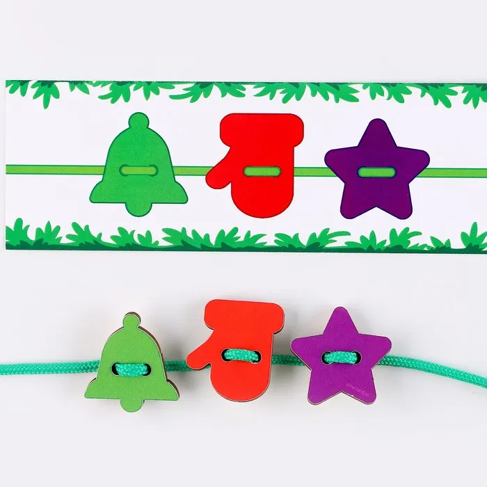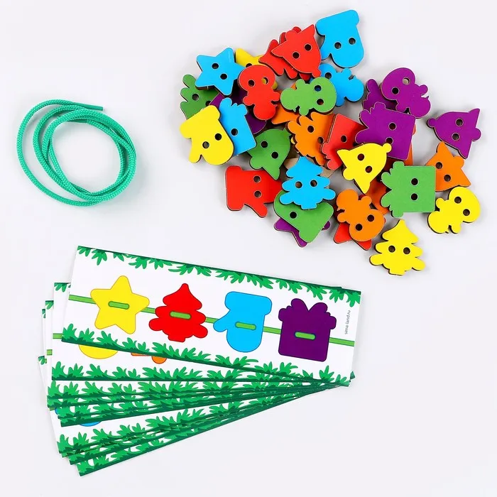 - Задача малыша — продевать шнурок сквозь отверстия в игровом поле.