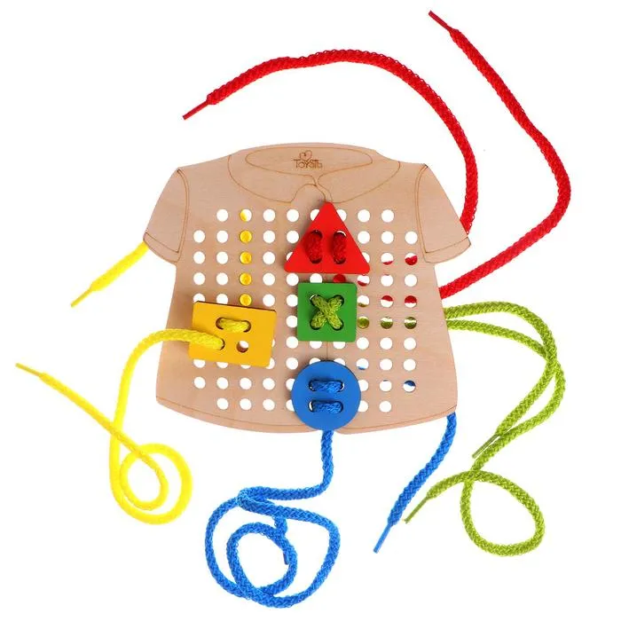 - Развивает мелкую моторику: работа с шнурком и деталями тренирует ловкость, координацию движений и точность пальцев.