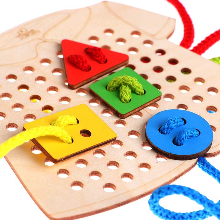 - Стимулирует логическое мышление: малыш учится соотносить отверстия и шнурок, подбирать цвета и формы.