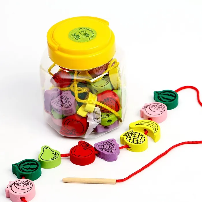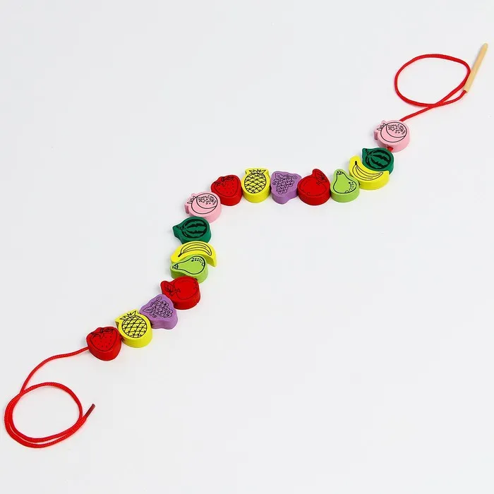 Шнуровка — это не только весёлое, но и развивающее занятие. Ребёнок учится нанизывать бусины, создавая узоры или украшения, что развивает логическое мышление и творческие способности. Игра также помогает освоить базовые навыки счёта и расширить знания о фруктах. Благодаря компактной упаковке, набор можно взять в дорогу или в гости, чтобы занять малыша в любом месте.