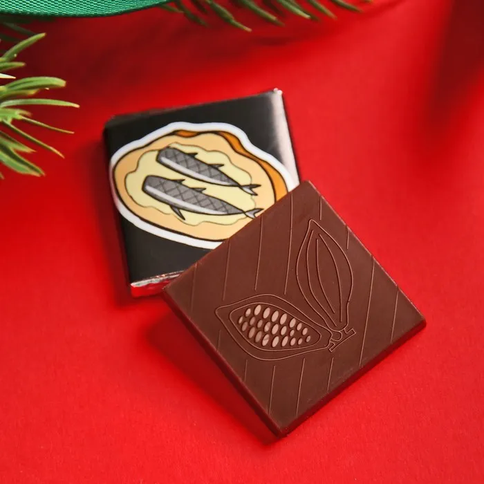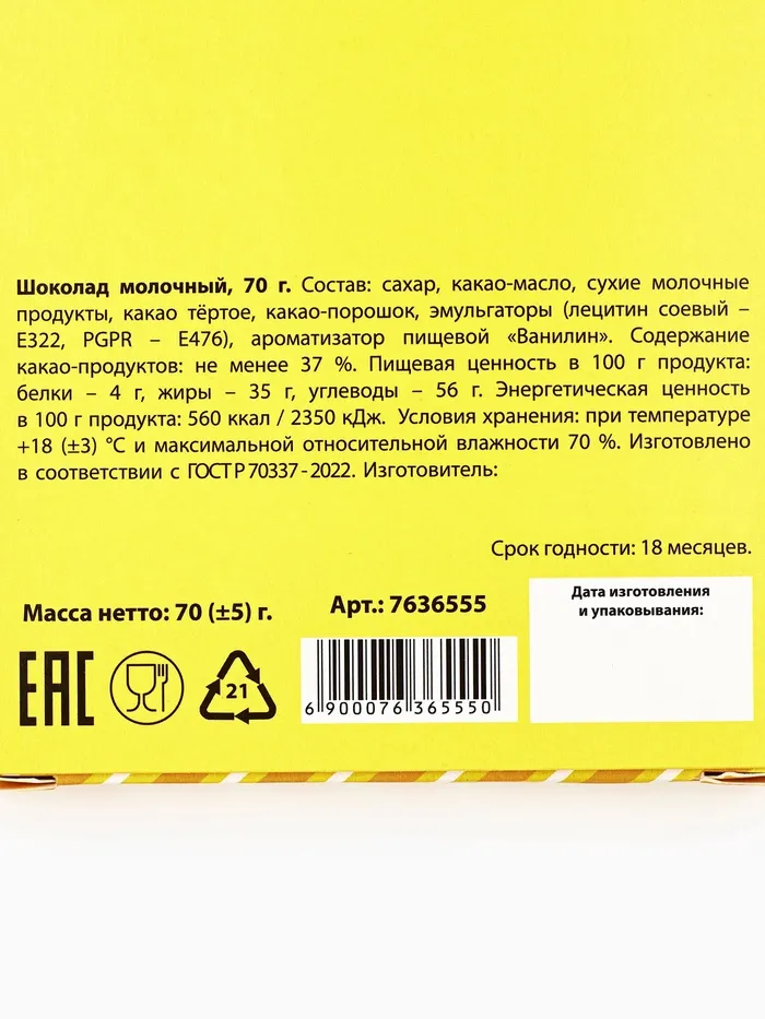 Состав: сахар, какао-масло, сухие молочные продукты, какао тертое, какао-порошок, эмульгаторы (лецитин соевый – Е322, PGPR – Е476), ароматизатор пищевой «Ванилин». Содержание какао продуктов – не менее 37 %.