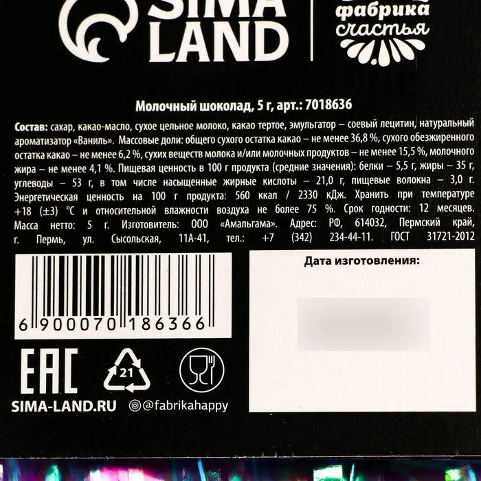 Шоколад мини молочный «Побольше сладостей», 5 г. — Характеристики