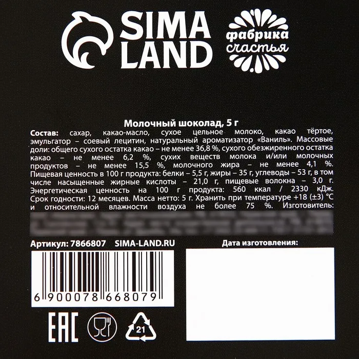 Состав: сахар, какао-масло, сухое цельное молоко, какао тёртое, эмульгатор – соевый лецитин, натуральный ароматизатор «Ваниль».
