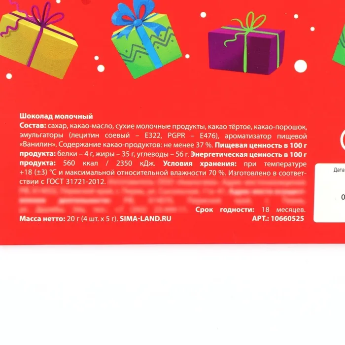 Состав: сахар, какао-масло, сухие молочные продукты, какао тёртое, какао-порошок, эмульгаторы (лецитин соевый – Е322, PGPR – Е476), ароматизатор пищевой «Ванилин». Содержание какао-продуктов: не менее 37 %.