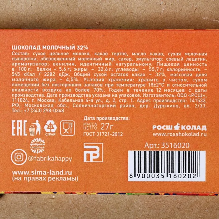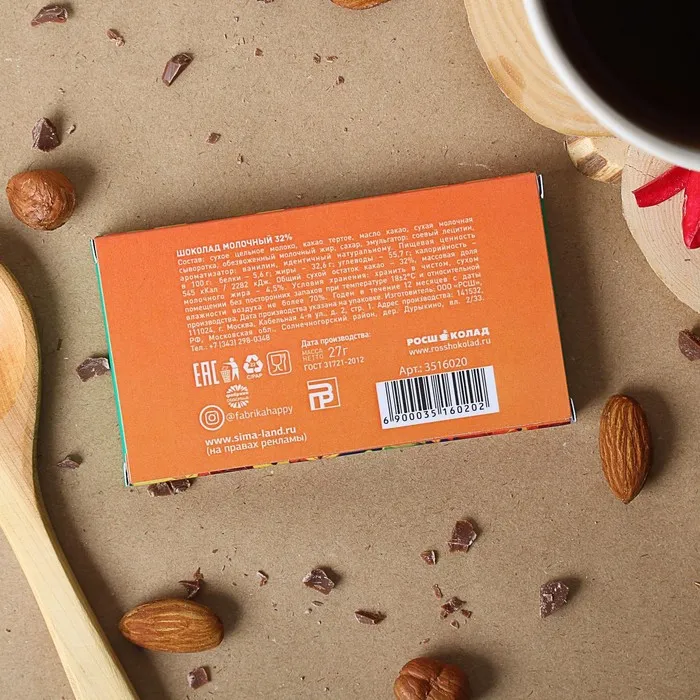 Состав: сухое цельное молоко, какое тёртое, масло какао, сухая молочная сыворотка, обезвоженный молочный жир, сахар, эмульгатор: соевый лецитин, ароматизатор, идентичный натуральному «Ванилин». Срок годности: 12 месяцев. Масса нетто: 27 г.