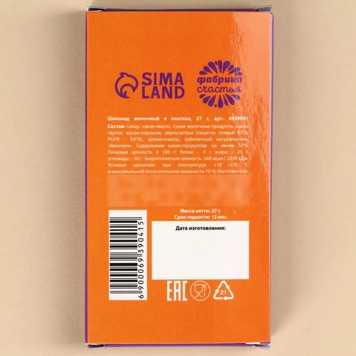 Состав: сухое цельное молоко, какао тёртое, масло какао, сухая молочная сыворотка, обезвоженный молочный жир, сахар, эмульгатор – соевый лецитин, ароматизатор, идентичный натуральному, «Ванилин».