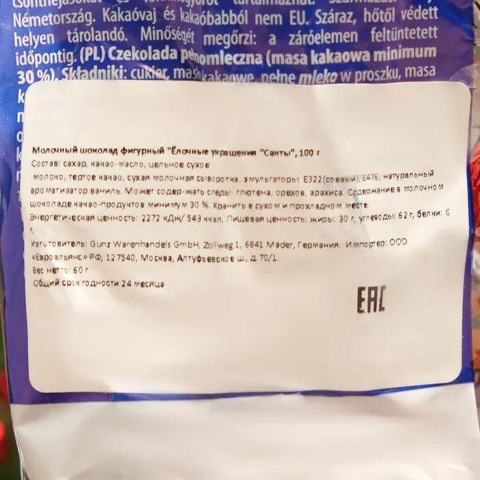 Шоколад молочный фигурный «Ёлочные украшения Санты», 100 г — Характеристики
