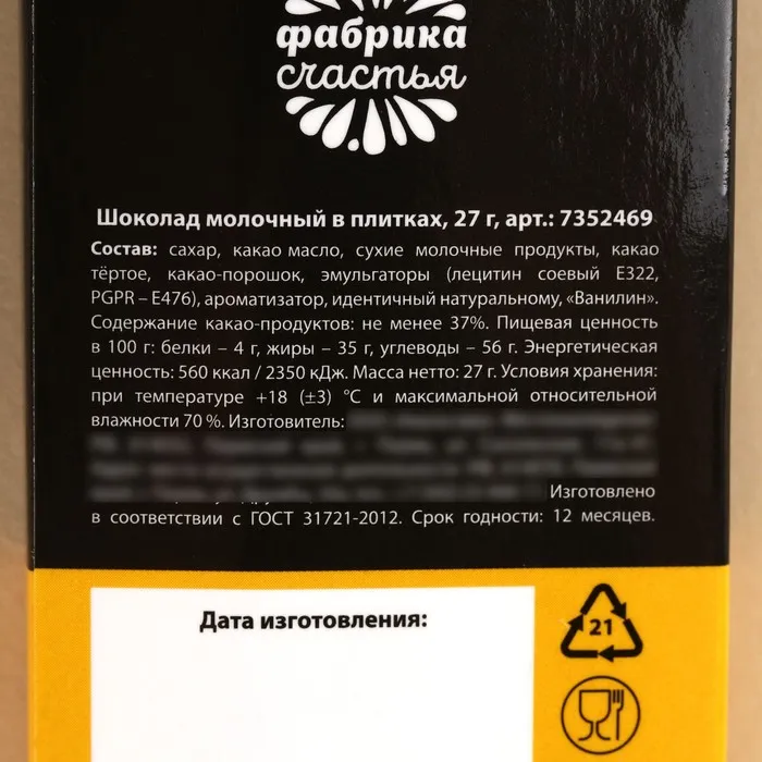 Состав: сухое цельное молоко, какао тёртое, масло какао, сухая молочная сыворотка, обезвоженный молочный жир, сахар, эмульгатор – соевый лецитин, ароматизатор, идентичный натуральному, «Ванилин».