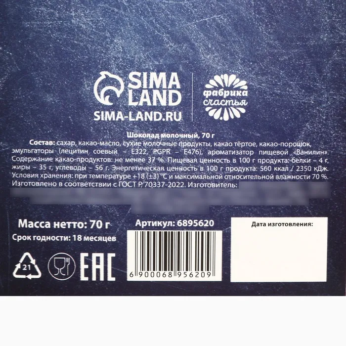 Состав: сахар, какао-масло, сухие молочные продукты, какао тертое, какао-порошок, эмульгаторы (лецитин соевый – Е322, PGPR – Е476), ароматизатор пищевой «Ванилин». Содержание какао продуктов не менее 37 %.