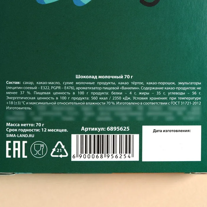 Состав: сахар, какао-масло, сухие молочные продукты, какао тертое, какао-порошок, эмульгаторы (лецитин соевый – Е322, PGPR – Е476), ароматизатор пищевой «Ванилин». Содержание какао продуктов не менее 37 %.