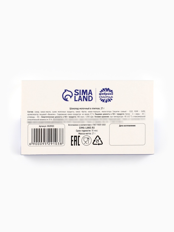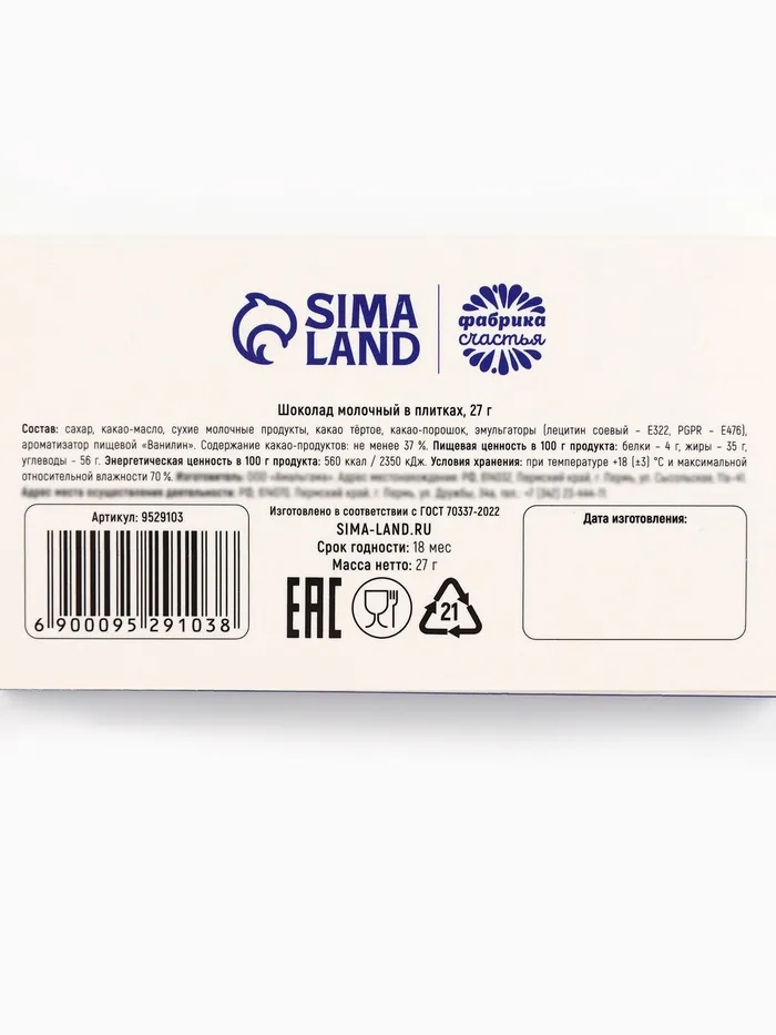 Состав: сахар, какао-масло, сухие молочные продукты, какао тёртое, какао порошок, эмульгаторы (лецитин соевый Е322, PGPR - Е476), ароматизатор, идентичный натуральному, "Ванилин".