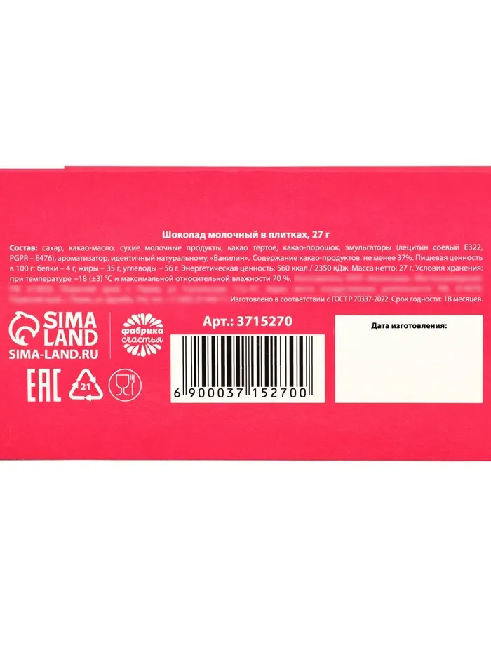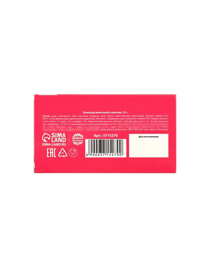 Шоколад молочный «От розовых соплей», 27 г — Характеристики