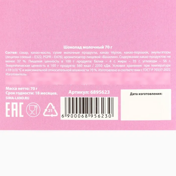Шоколад молочный «Самой лучшей маме», 70 г. — Характеристики