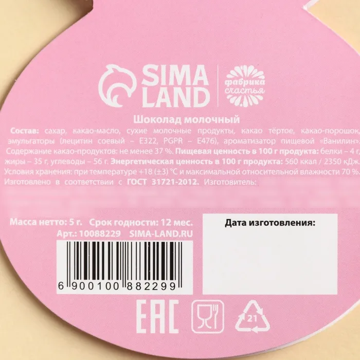 Шоколад молочный в открытке «8 марта», 5 г. — Характеристики