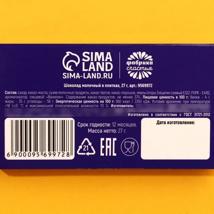 Шоколад молочный «Волк», 27 г. — Характеристики