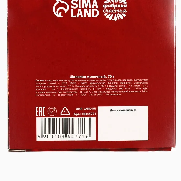 Состав: сахар, какао-масло, сухие молочные продукты, какао тёртое, какао-порошок, эмульгаторы (лецитин соевый – Е322, PGPR – Е476), ароматизатор пищевой «Ванилин». Содержание какао-продуктов: не менее 37 %.
