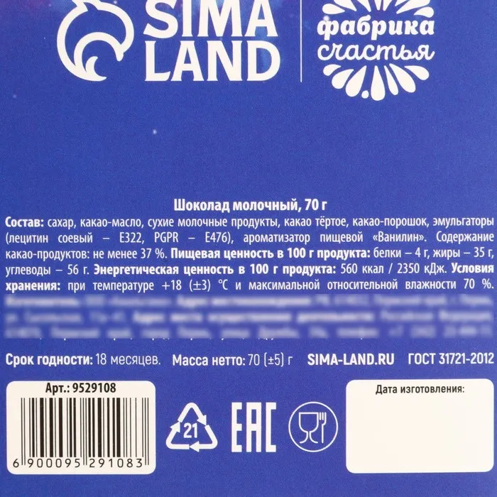 Состав: сахар, какао-масло, сухое цельное молоко, какао тёртое, эмульгатор - соевый лецитин, натуральный ароматизатор "Ванилин".