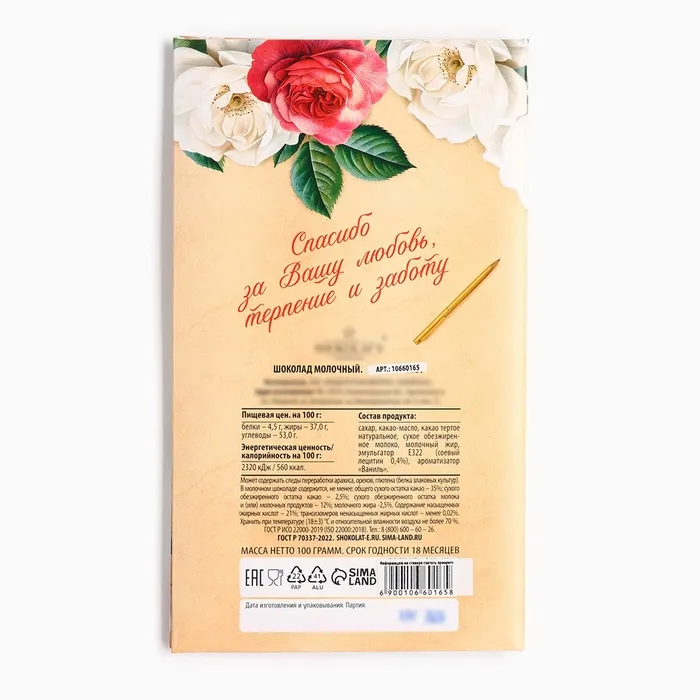 Шоколад с открыткой «Дорогому учителю», 100 г. — Характеристики