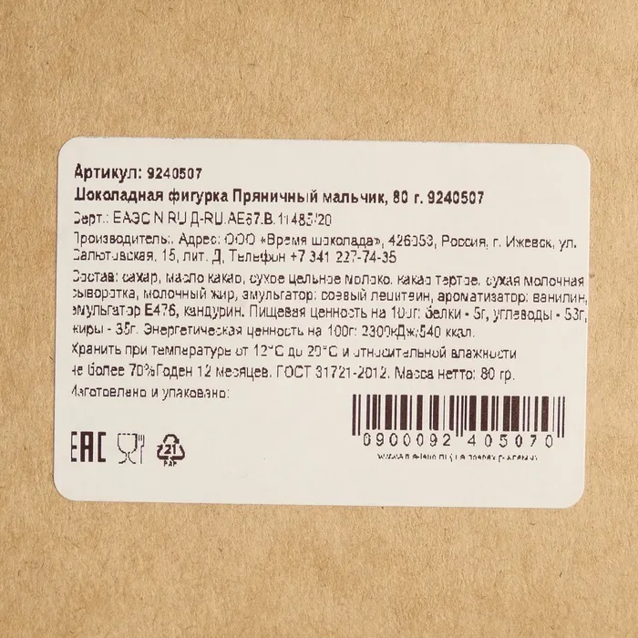 Шоколадная фигурка "Пряничный мальчик", бельгийский шоколад, 80 г — Характеристики