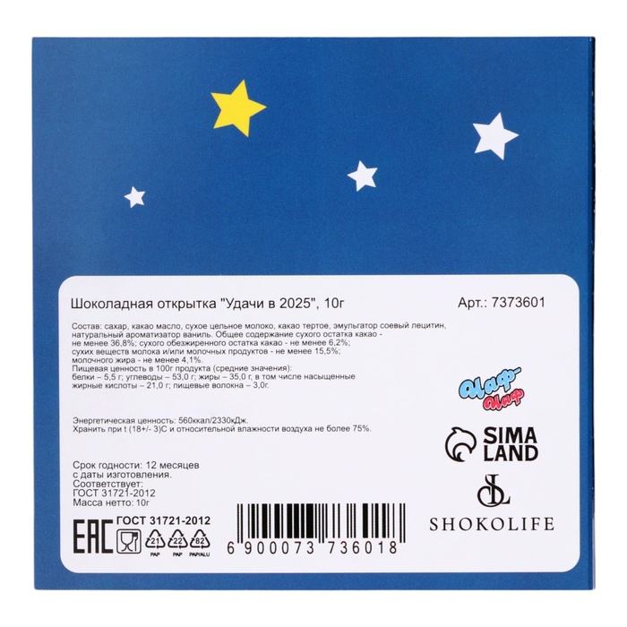 Шоколадная открытка "Удачи в 2025", 2 шт х 5 г — Характеристики