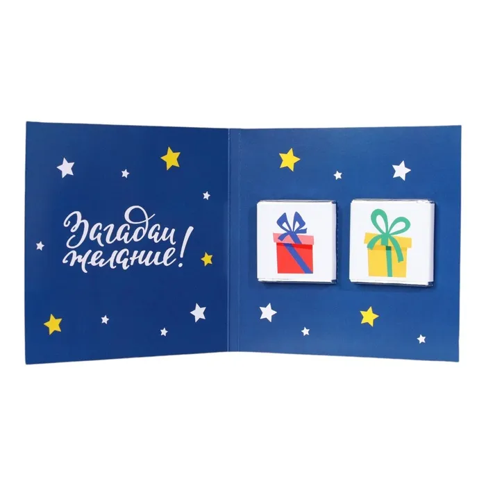 Шоколадная открытка – необычный и оригинальный способ поздравить с Новым годом! В ассортименте представлены интересные, забавные пожелания на любой вкус. Внутри каждой открытки вы найдёте маленькую шоколадку из настоящего шоколада высокого качества от российских и бельгийских производителей. Благодаря качественному составу, ваш сюрприз будет не только красивым, но и действительно вкусным!