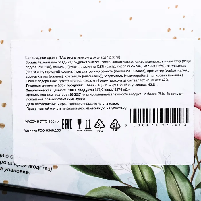 Не упустите возможность насладиться этой уникальной комбинацией, которая дарит гармонию и радость в каждом кусочке. Откройте для себя своеобразное удовольствие с драже «Малина в темном шоколаде» и погрузитесь в мир наслаждения, где каждая ягодка рассказывает свою историю, а шоколад придает крылья вашим вкусам!