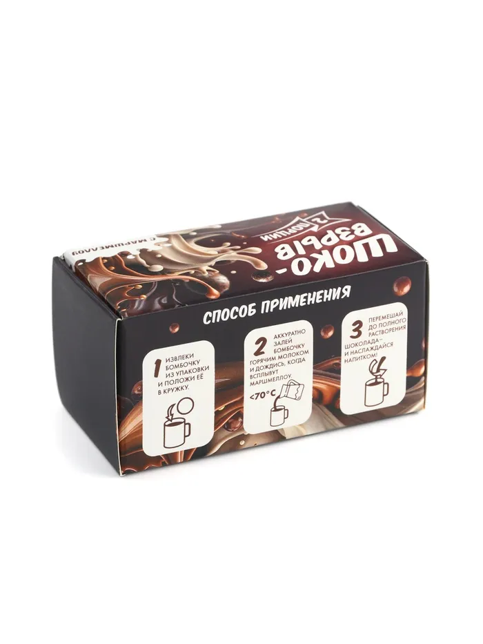 Способ приготовления: вынуть шар из упаковки и положить его в чашку. Медленно залить шар горячим молоком. Подождать, когда всплывут маршмеллоу. Перемешать содержимое до полного растворения шоколада.