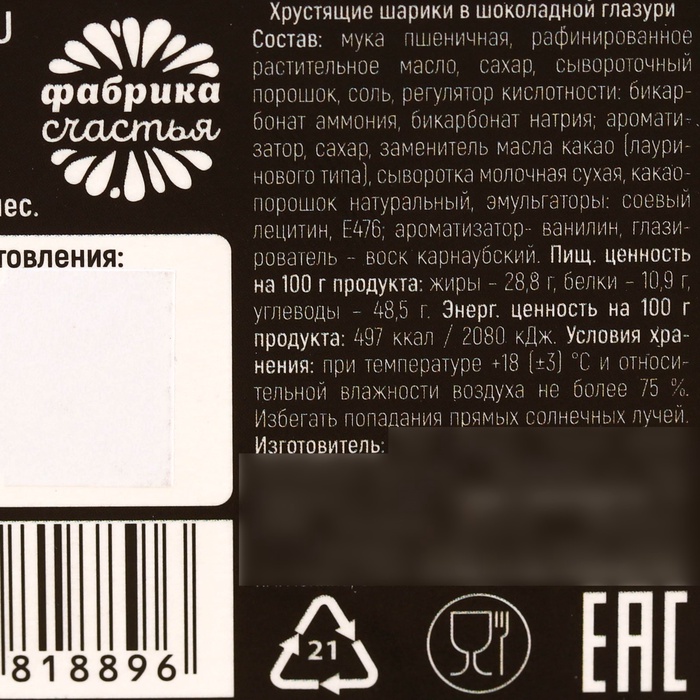 Состав: мука пшеничная, рафинированное растительное масло, сахар, сывороточный порошок, соль, регуляторы кислотности: бикарбонат аммония, бикарбонат натрия; ароматизатор, сахар, заменитель масла какао (лауринового типа), сыворотка молочная сухая, какао-порошок натуральный, эмульгаторы: соевый лецитин, Е476; ароматизатор – ванилин, глазирователь – воск карнаубский.