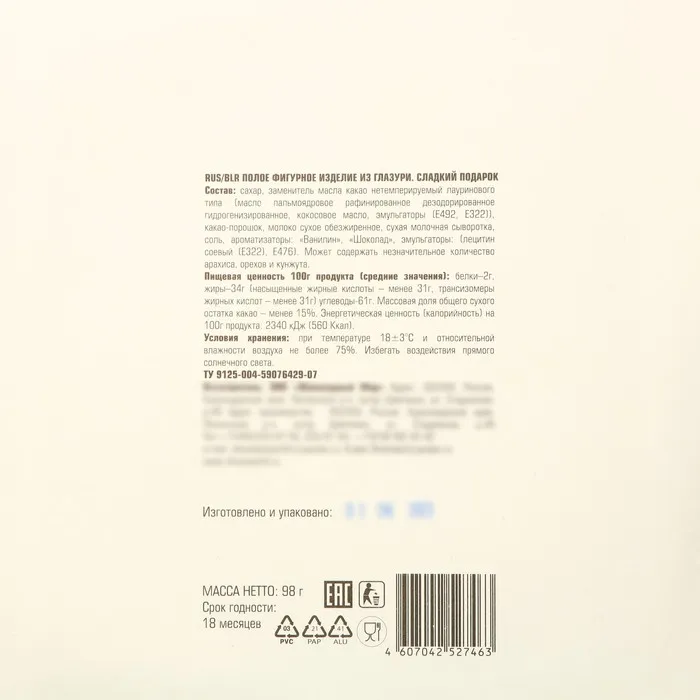 Пищевая ценность 100 г продукта (средние значения): белки - 2 г, жиры- 34 г (насыщенные жирные кислоты - менее 31 г, трансизомеры жирных кислот - менее 31 г) углеводы - 61 г. Массовая доля общего сухого остатка какао - менее 15%. Энергетическая ценность (калорийность) на 100 г продукта: 2340 кДж (560 Ккал).