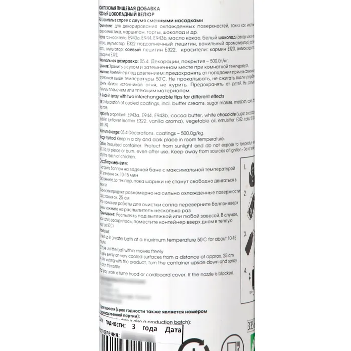 Перед использованием баллон должен находиться в теплом помещении в течение часа, и иметь температуру около 30С. Перед нанесением спрея-велюра кондитерские изделия должны быть охлаждены в морозильной камере и иметь температуру не выше минус 20С. Спрей наносить на поверхность торта на расстоянии 20 см при помощи коротких нажатий.