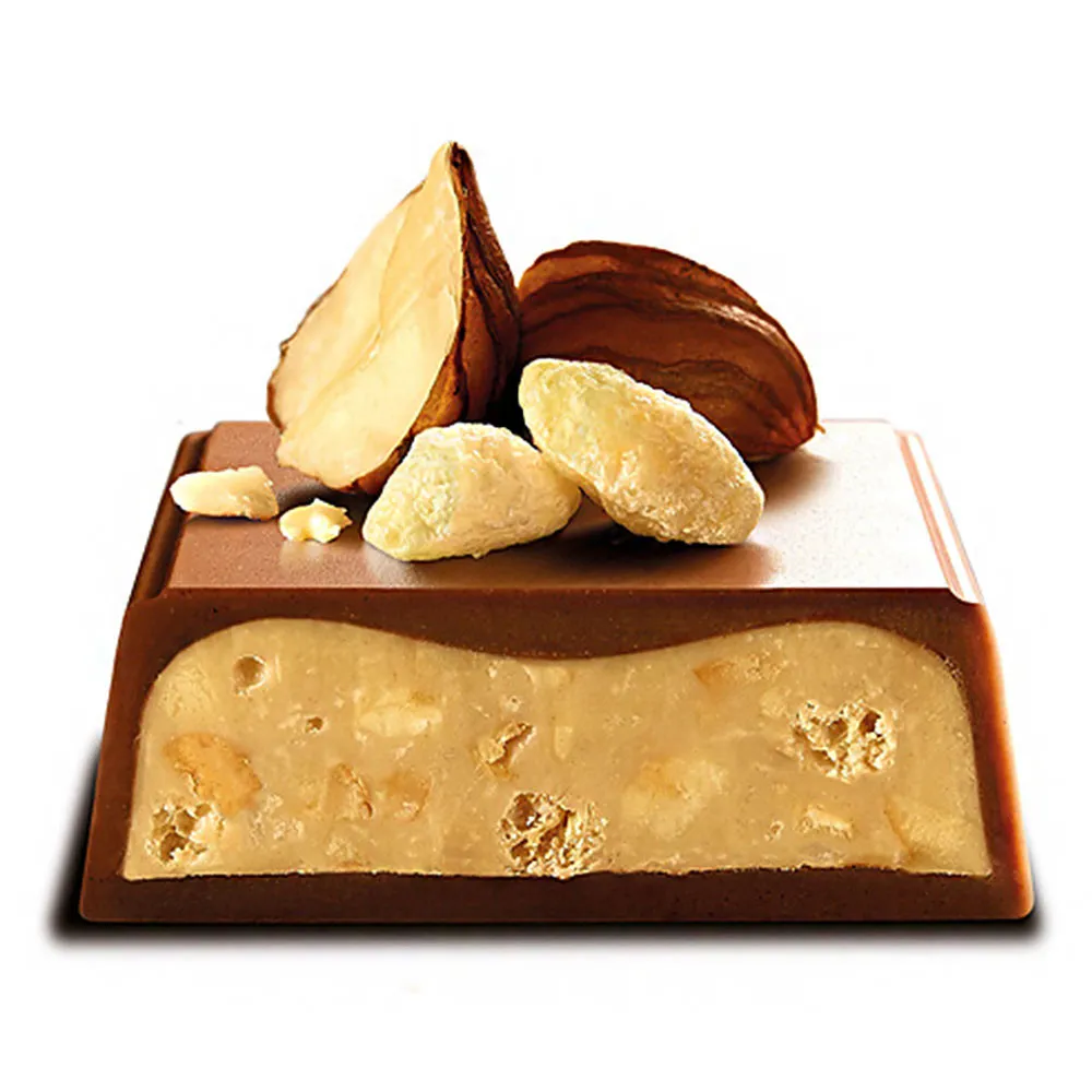 Четыре квадрата молочного шоколада раскрывают самый неотразимый наполнитель: хрустящий пралине, который уважает традиции и добавляет новые грани вкуса!