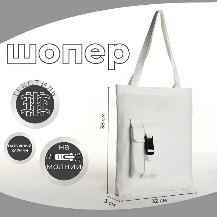 Шопер на молнии, из текстиля, цвет белый — Характеристики