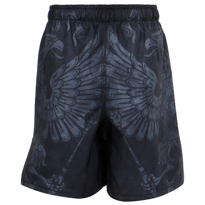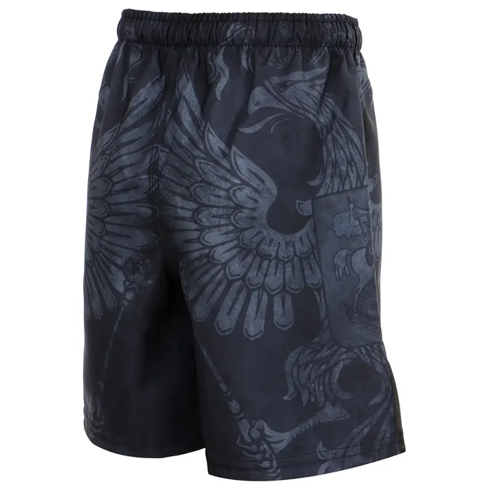 Шорты предназначены для занятий ММА и другими видами единоборств. Изготовлены из полиэстера. Ткань обладает абсорбирующими свойствами, эффективно отводит влагу от тела во время тренировки и быстро сохнет. Шорты имеют эластичный пояс со шнурком-затяжкой. Эластичная вставка между ног и разрезы по бокам обеспечивают комфорт. Рисунок выполнен путём сублимации, что гарантирует стойкость и сохранность цвета после стирки.